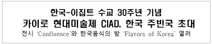 이번 축제에서는 한국 현대미술 작가 6인의 작품을 소개하는 특별 전시 ‘Confluence(만남)’가 10월 12일부터 11월 2일까지 카이로 다운타운에 위치한 코닥 패시지(Kodak Passage)에서 개최된다. 본 전시는 한국의 동시대 미술이 지닌 실험성과 감수성을 이집트 관객에게 소개하고, 두 문화의 접점을 시각적으로 탐색하는 데 초점을 둔다.