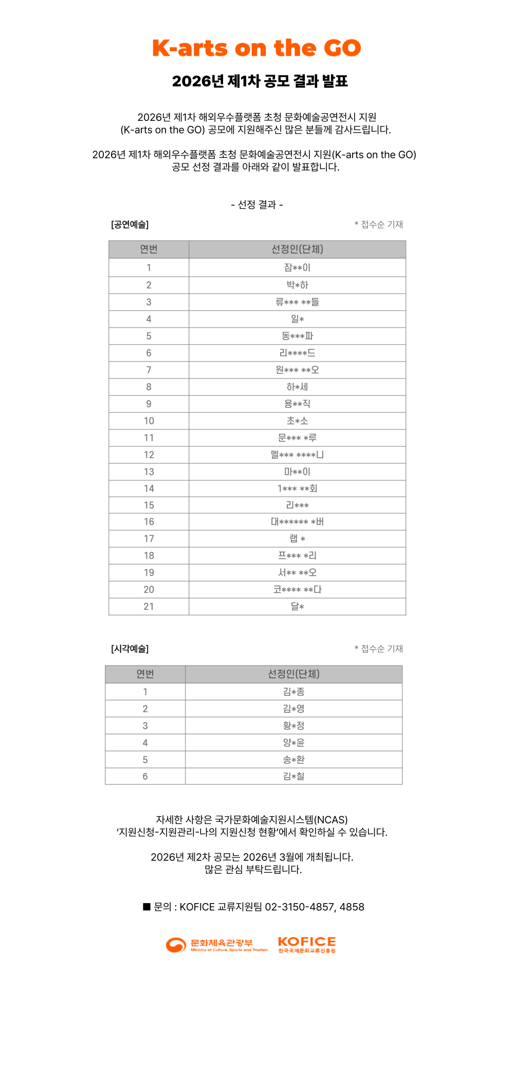 <해외우수플랫폼 초청 문화예술공연전시 지원(K-arts on the GO)> 2026년 제1차 공모 선정 결과 발표